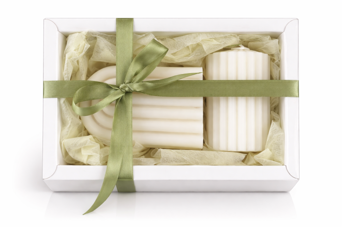 Setul conține lumânări decorative cu forme moderne, realizate din ceară naturală de soia și ambalate într-o cutie premium cu fundă satinată.